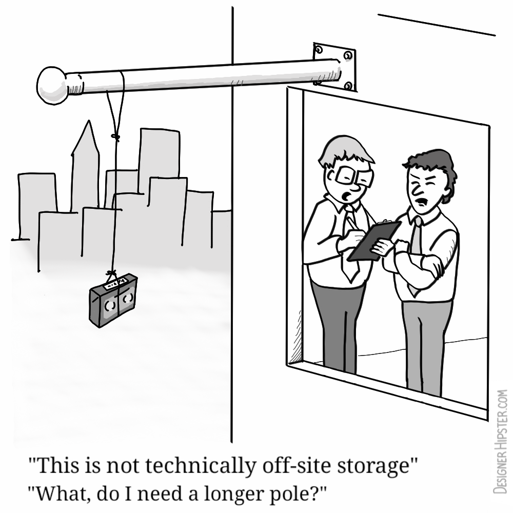 During an IT audit, an auditor is informing the client that hanging a backup tape from a flag pole does not constitute offsite storage. The man asks if making the pole longer would make any difference. Accounting comics. Audit comic.