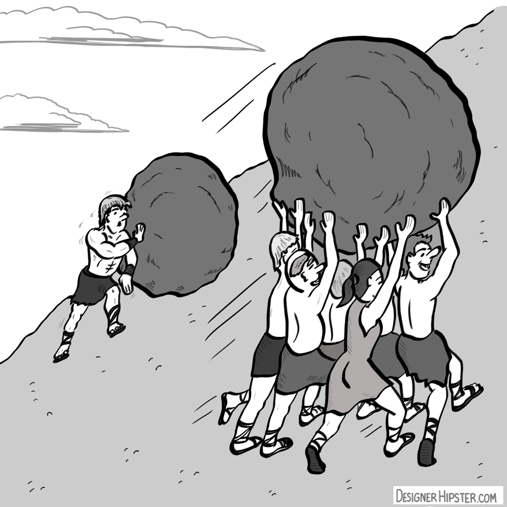 Cartoon of Sisyphus rolling a stone up a mountain alone watching a group carrying a stone run past. A demonstration of how teamwork is better than going it alone.