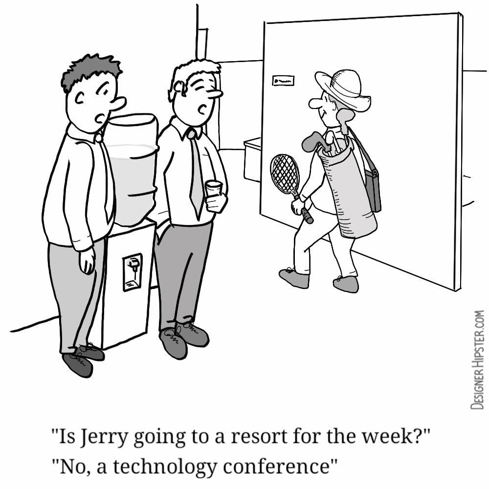 Two men at a water cooler are discussing where a coworker is going. The coworker passes by carrying golf clubs and a tennis racquet. Conferences are like company paid for vacations. Presentation comics.
